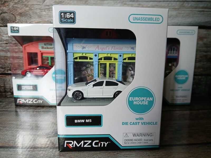 Modellino auto BMW M5 Diorama Model Kit European House scala 1:64 da collezione RMZ City