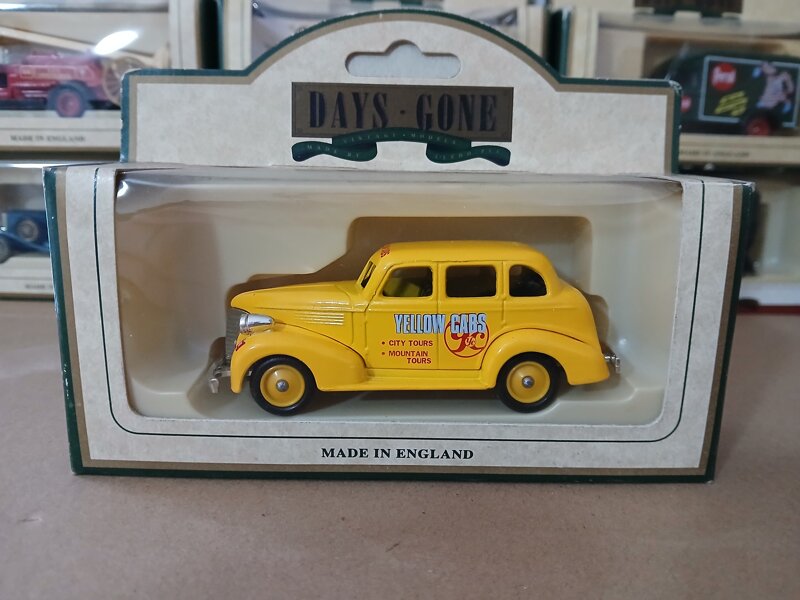 Modellino auto Chevrolet Car Yellow Cabs 1939 Lledo Days Gone Made in England da collezione. La confezione è rovinata data l'età dell'articolo