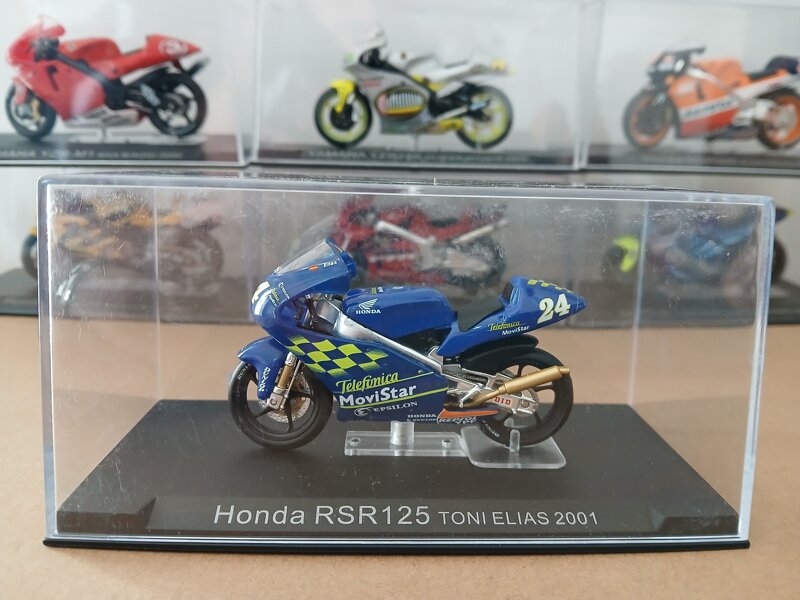 Modellino moto Honda RSR125 Toni Elias 2001 scala 1/24 da collezione Grandi Moto Da Competizione DeAgostini con teca